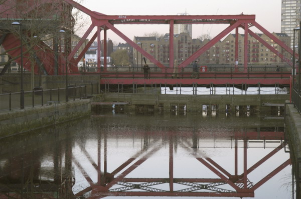 ![]() This lifting bridge taking Rotherhithe Road across the dock entrance is now just a decorative feature |
