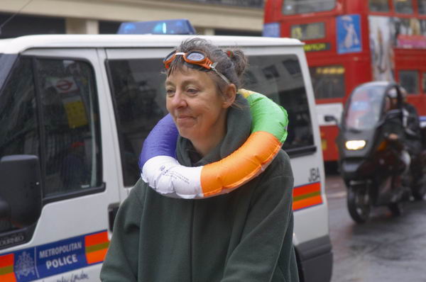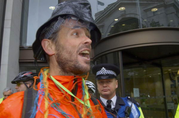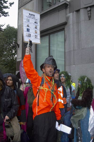 European Social ForumLondon, Friday 15 Oct, 2004:London Underwater 2050 tour of the G8 Climate Criminals Conducting the band outside Exxon Mobil offices in Kingsway, London |