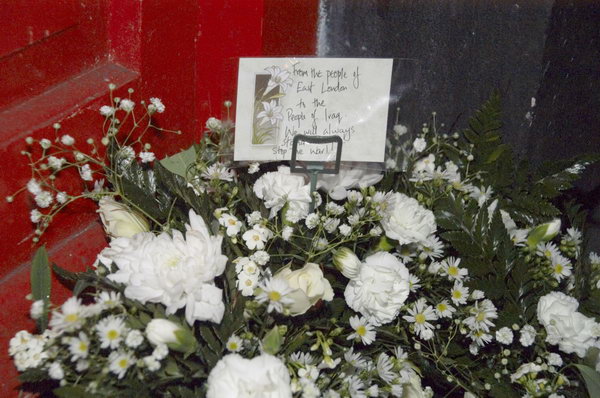 ![]() leave at the door of local MP Oona King on Bethnal Green Road. ![]() After a short ceremony including prayers, the flowers were left, the card on them reading: ![]() "From the people of East London to the People of Iraq. We will always stand by you. Stop the War!" |