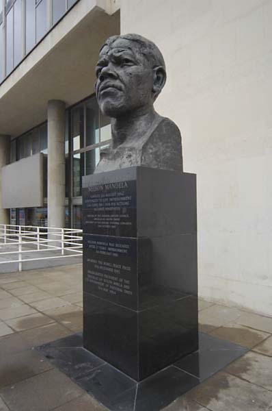 ![]() and on to the bust of Nelson Mandela, sculpted by Ian Walters, commisioned by the GLC to mark the 70th anniversary of the African National Congress in 1982, and unveiled by Oliver Tambo in 1985. It records Mandela's imprisonment in 1962, with added inscriptions marking his release in 1990, the Nobel Peace prize in 1993 and his inauguration as the first president of a free South Afrrica in 1994. |