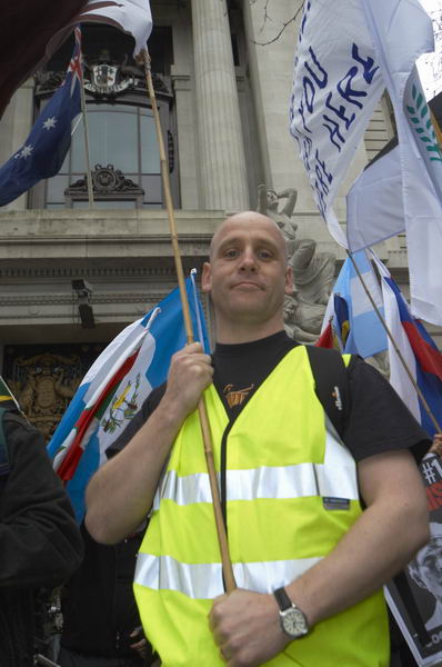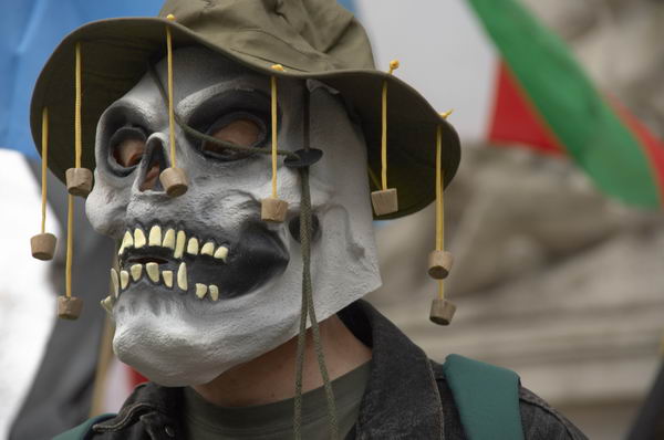 ![]() This Australian 'grim reaper' posed with 'John Howard' and the 141 national flags outside the Australian High Commission, London. |