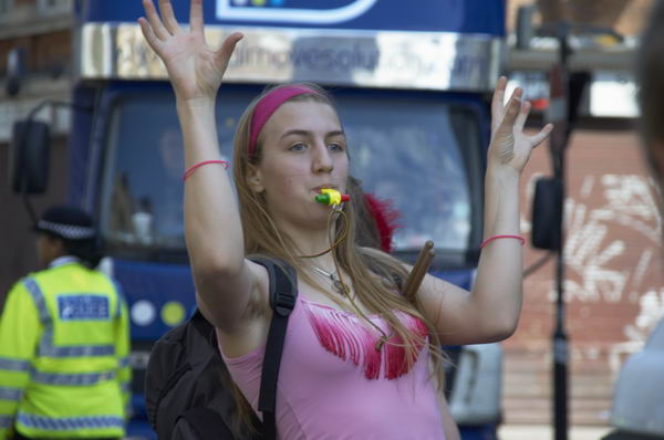 ![]() Four young women carried a large pink banner, "Queers without borders." ![]() The leader of the samba band |