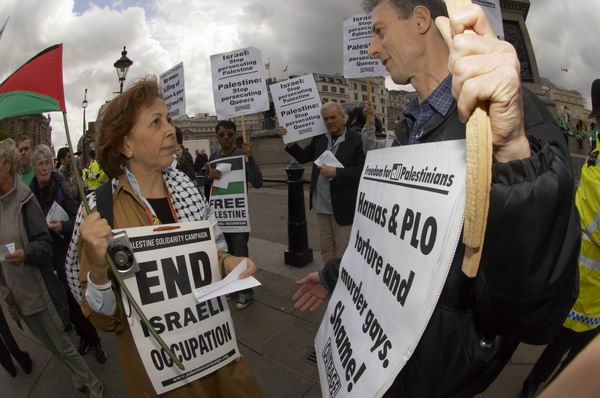 ![]() A demonstrator talks to Peter Tatchell ![]() |