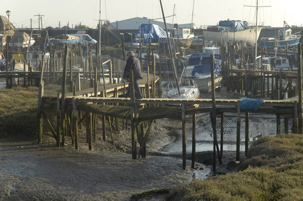 ![]() Man on boardwalk between moorings, Smallgains Creek, Canvey Island, Essex |