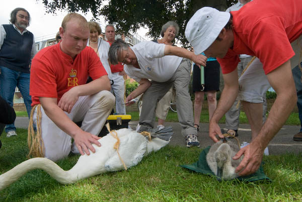 ![]() The cords are used to tie the swan's feet behind their back - after which they normally stop struggling and relax. |