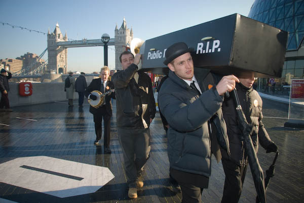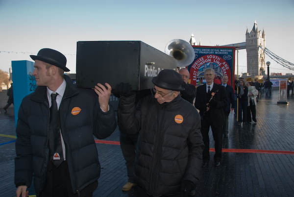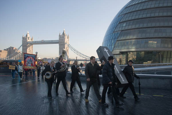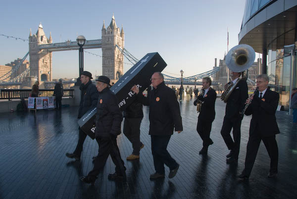 ![]() Tower Bridge and City Hall with the coffin, jazz band and union banners. |