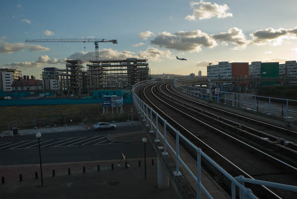 ![]() Plane coming in to land at London City Airport, seen from DLR Gallions Reach. |