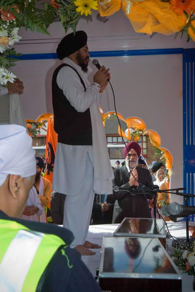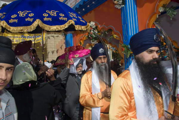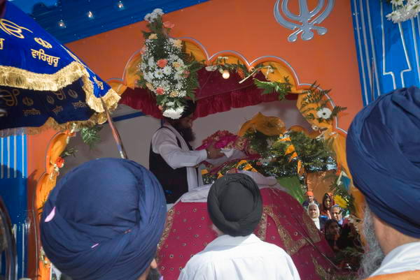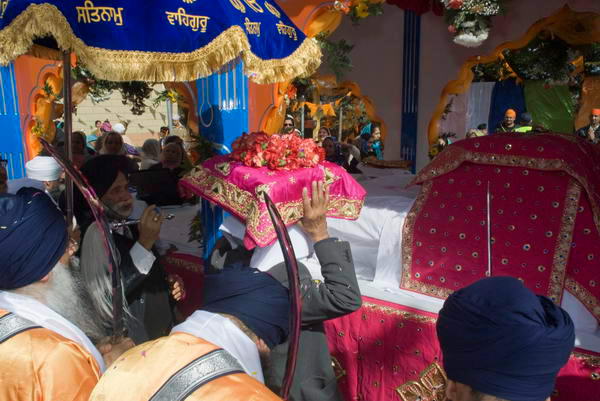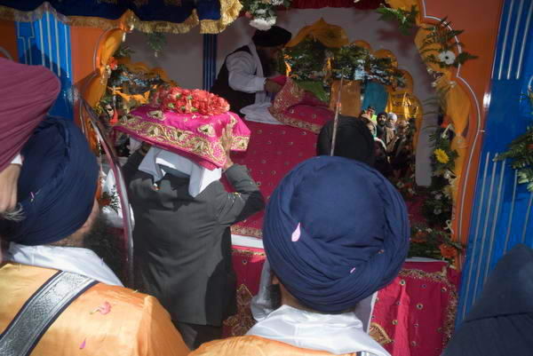 Sri Guru Granth Sahib is brought out of the Gurdwara to be placed in the Palki truck