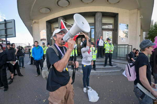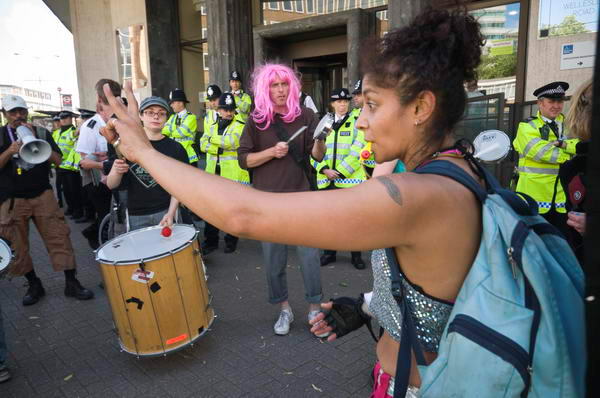 ![]() Rhythms of Resistance entertain a large crowd of police at Electric House (with many more behind me out of picture) |