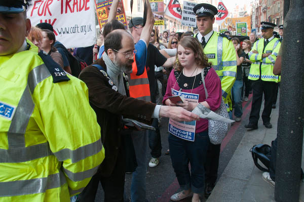 Police would not let protesters out of the march to hand out leaflets