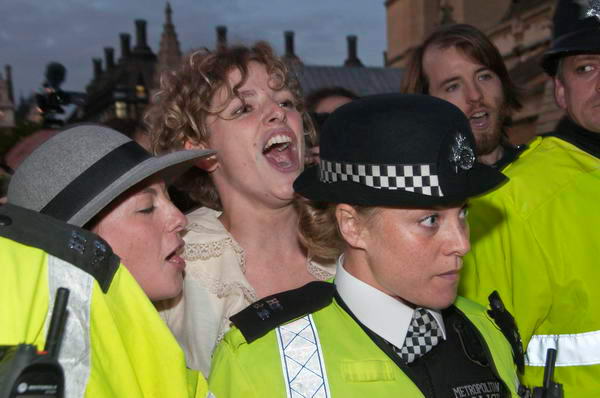 Tamsin Osmond looks jubilant as the Climate Rush reaches the Houses of Parliament