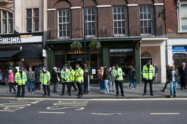 Police at the McDonald's trashed on Mayday 2000 - almost 8 years too late