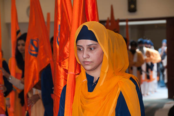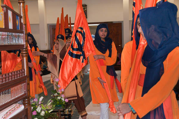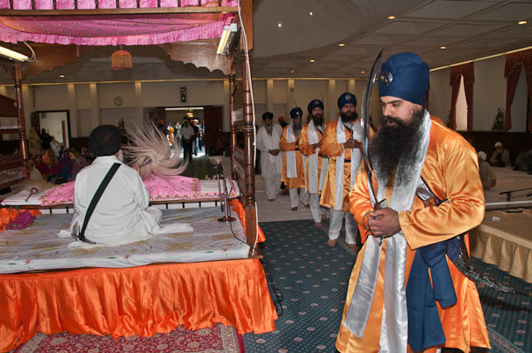 Then walks round behind the canopied throne for the Guru Granth Sahib