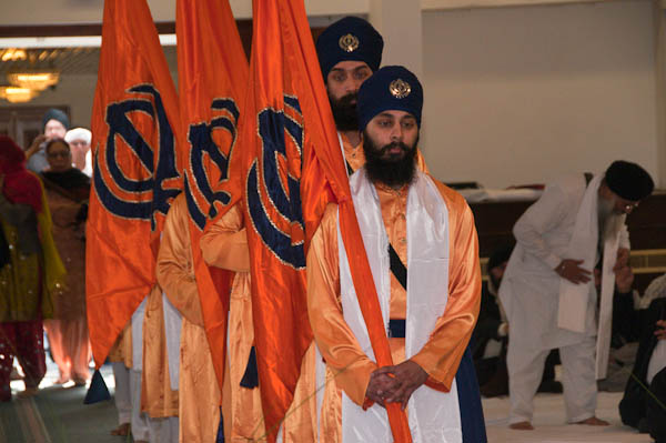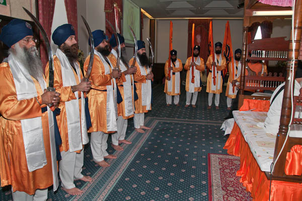 The Panj Pyare stand behind the Guru Granth Sahib during the worship