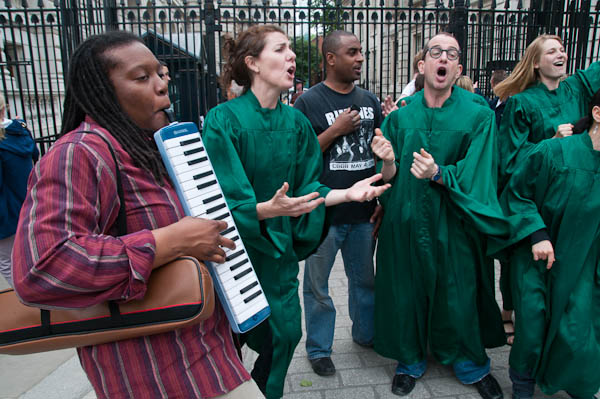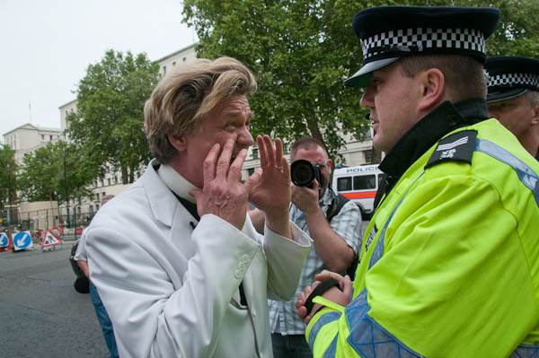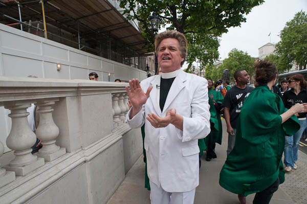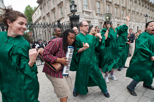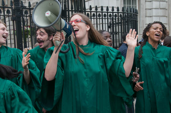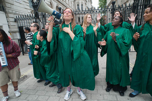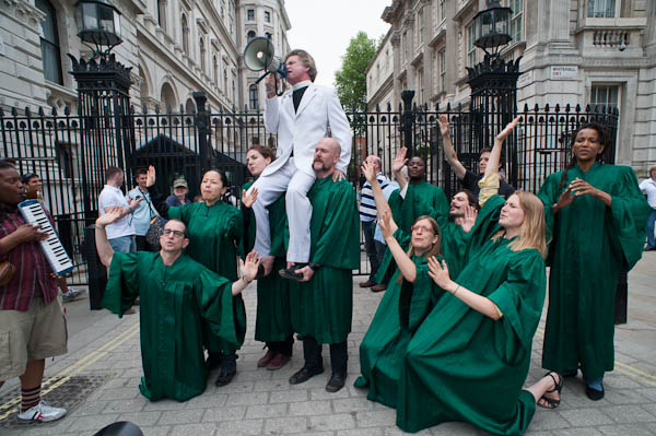 Reverend Billy and the Life After Shopping choir perfrom on the pavement outside Downing St - where police allow no protests