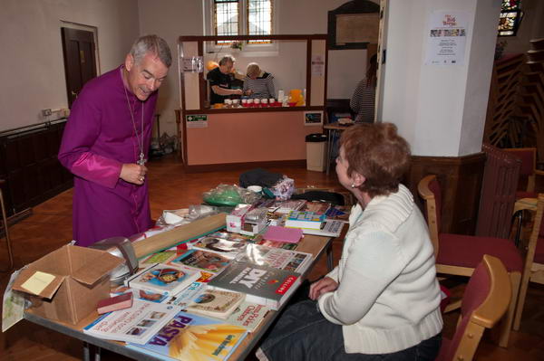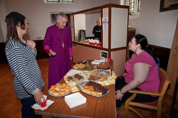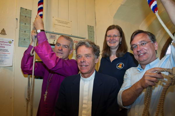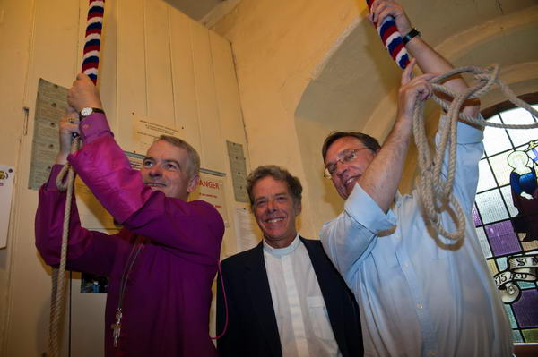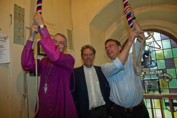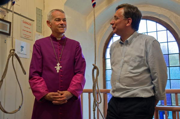 In the bell loft - the Bishop and MP Gareth Thomas pretent to pull the ropes