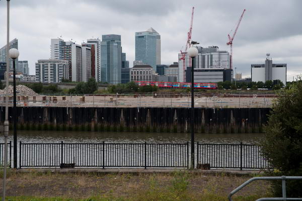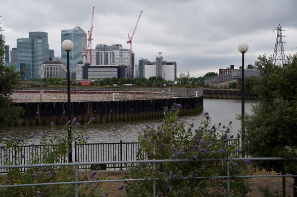 There has been no access to the riverside walkway since it was built - I think over ten years ago. As well as providing access to Canning Town transport interchange from across the river in Tower Hamlets it was also supposed to provide a walkway to the arts centre at Trinity Buoy Wharf, and a competition was held (and the winner announced) for a new footbridge) around five years ago. The plans for the redevelopment of the flattened site in the middleground also include a footbridge to Canning Town.