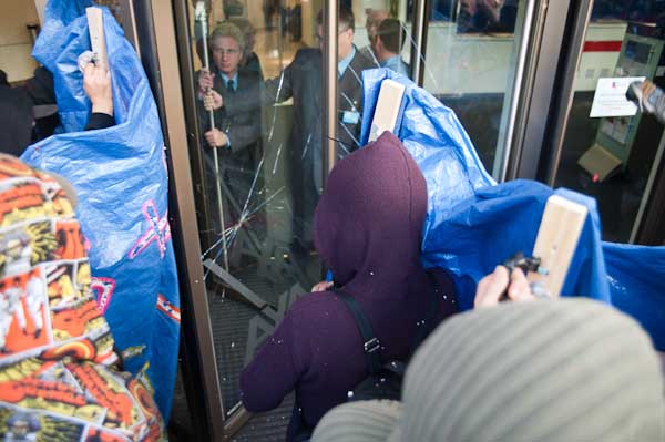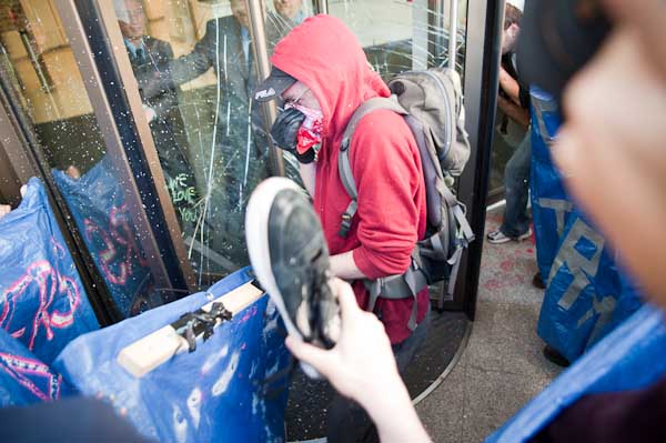 ![]() I was hit by some fake blood thrown at the building and I think the odd shoe |