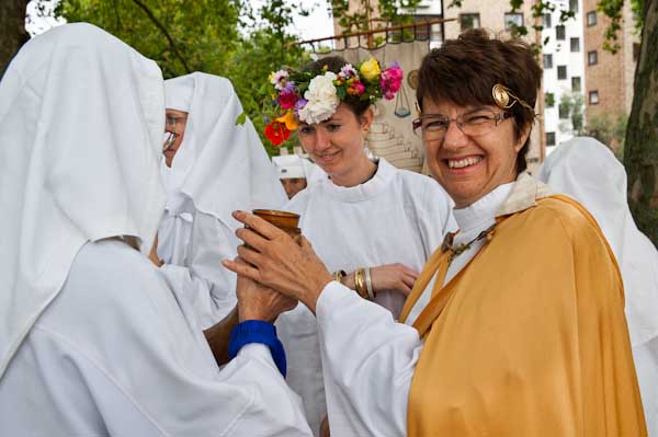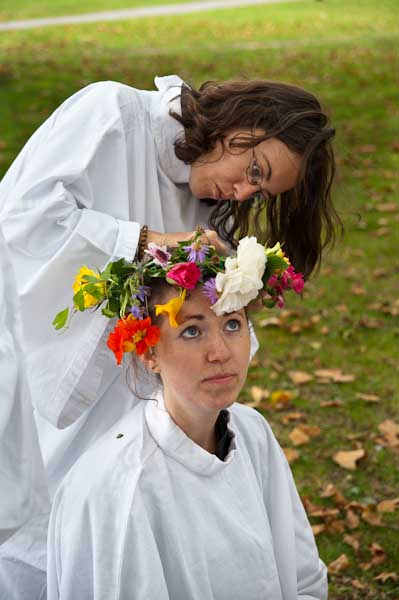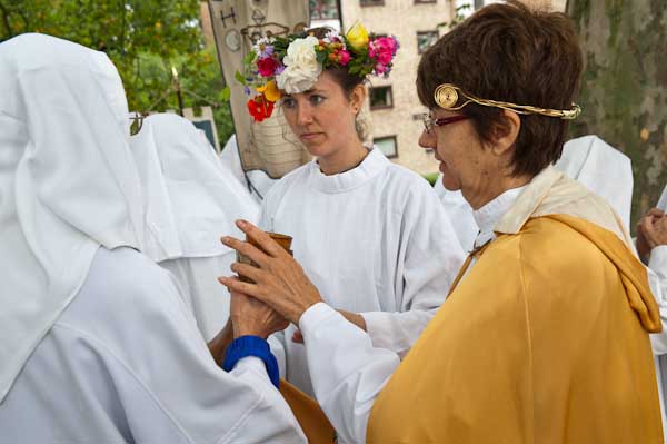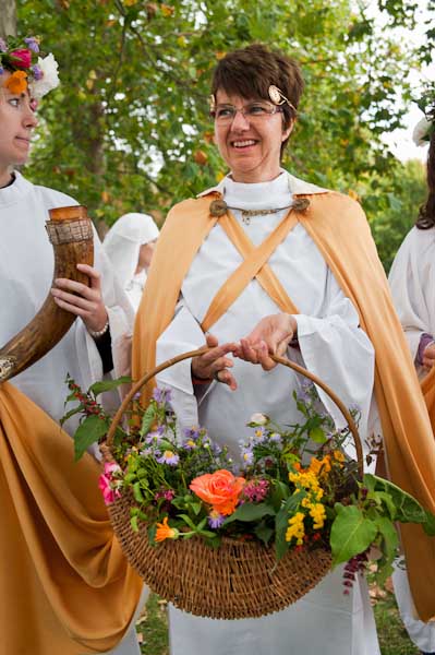 and given to one of her assistants to carry while she holds a basket of flowers and fruit