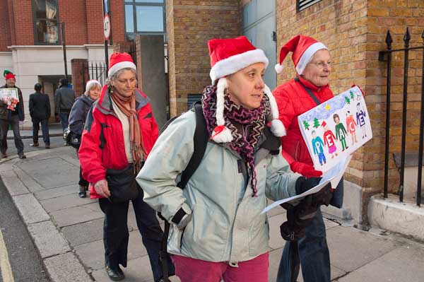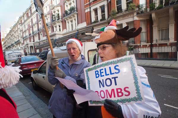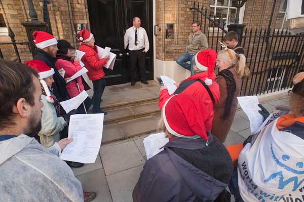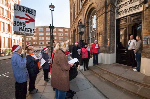 Singing anti-nuclear carols outside Manning House, where Lockheed Martin have offices on the second floor