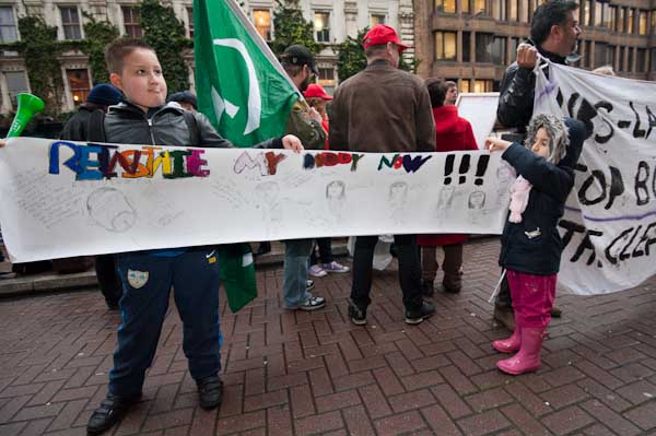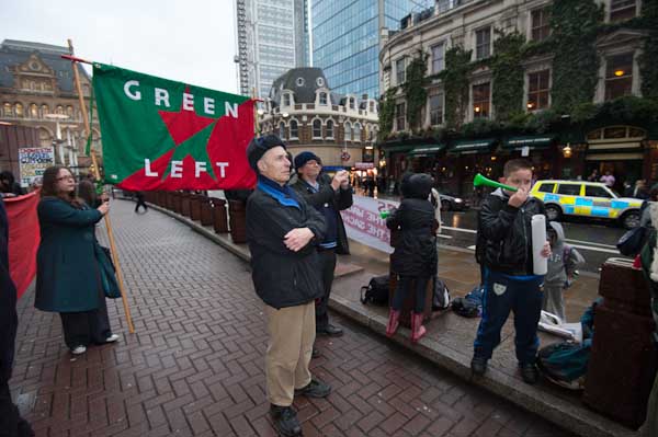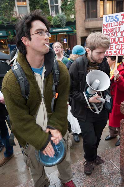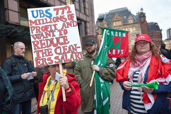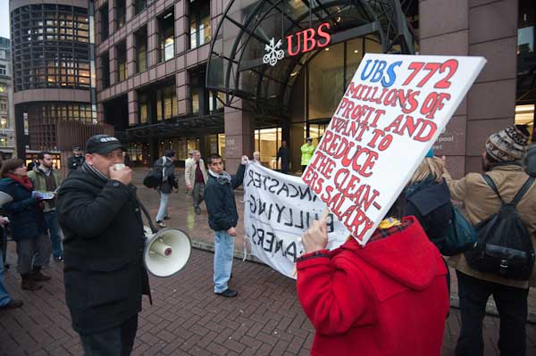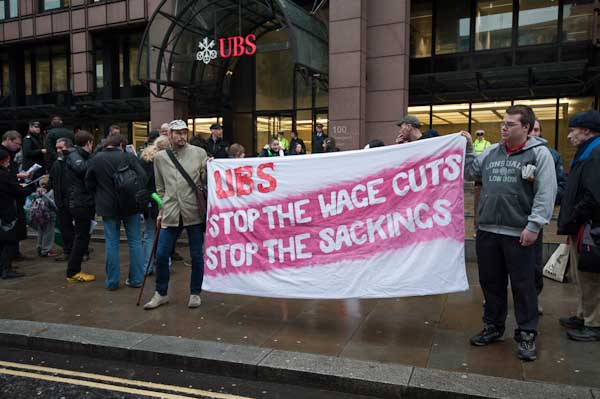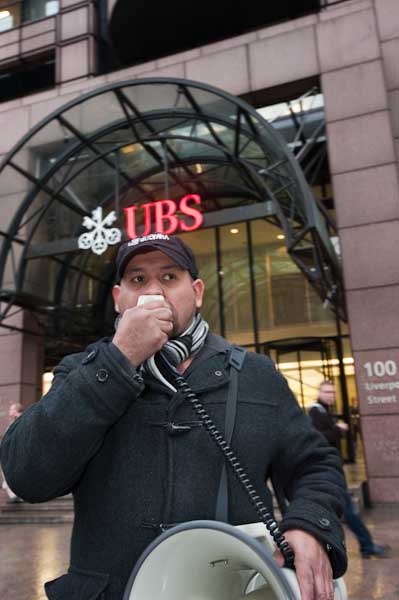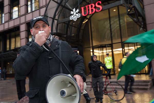 Protesters gather outside the United Bank of Switzerland in Liverpool St