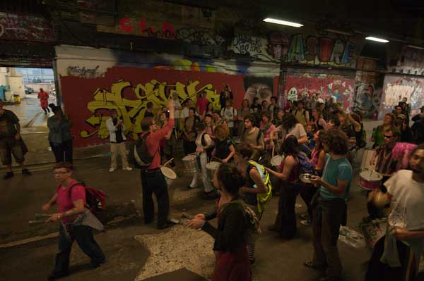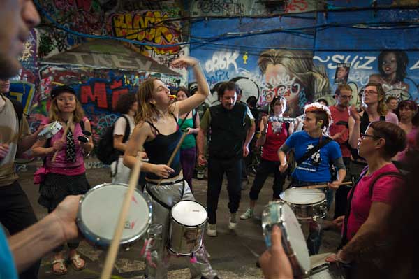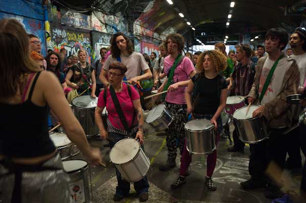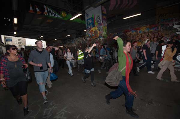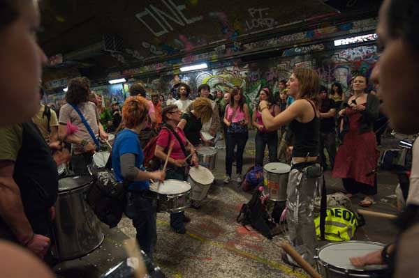 Rhythms of Resistance marched across Waterloo Bridge and into Leake St where I caught up with them