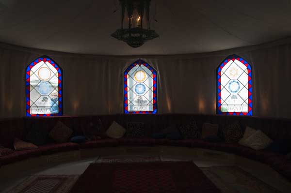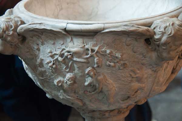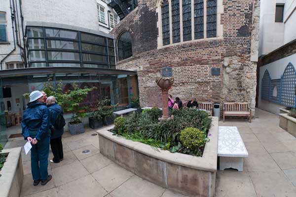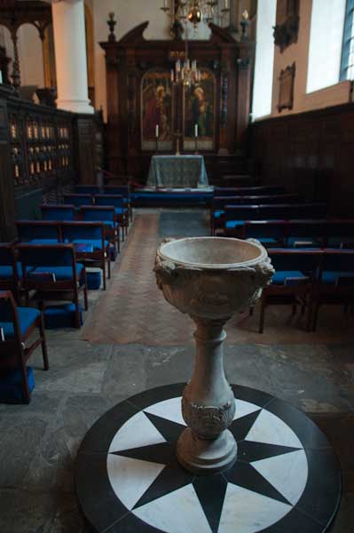 The Glover's window - "True Hearts and Warm Hands' and font with Adam and Eve at St Martins Ludgate