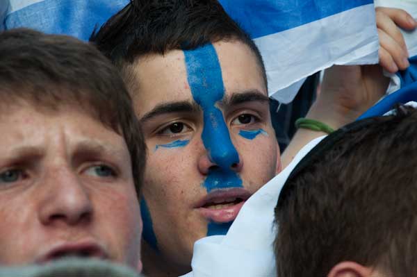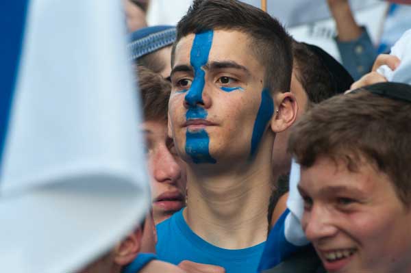 One young man in the crowd with blue paint on his face, the colour of the Israeli flag