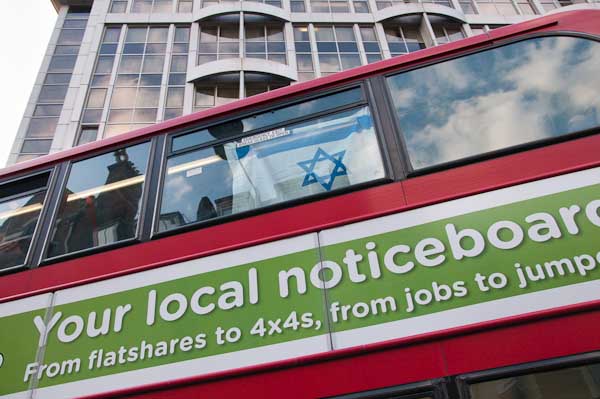 An Israeli flag on the top deck of a passing bus 'Your local noticeboard'!
