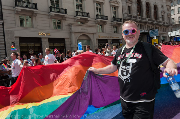 The Gay Liberation Front banner leads the march. Peter Tatchell carries an Outrage placard calling for an