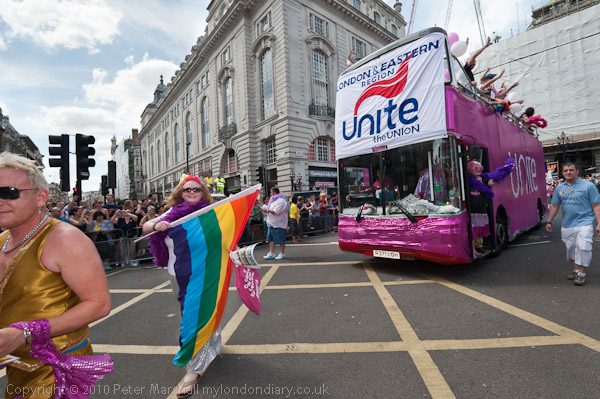 The Unite London & Eastern Region bus, led by a woman with a rainbow flag