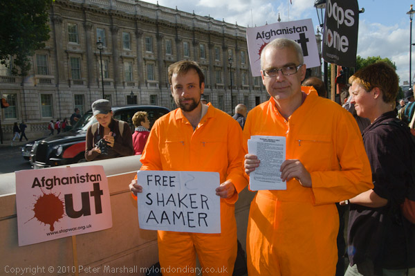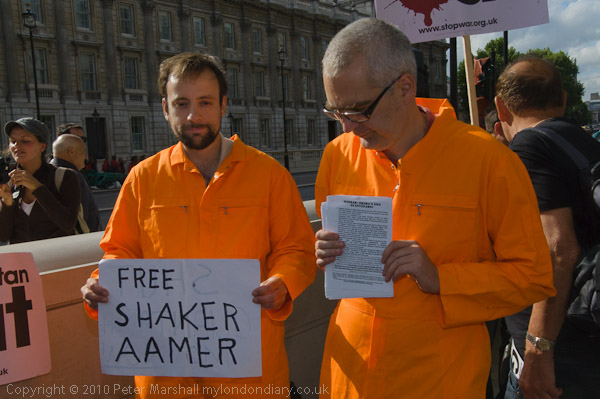 ![]() Stop the War demonstrators opposite Downing St ![]() ![]() ![]() 'Free Shaker Aamer' - a former UK resident is still being held in Guantanamo Bay ![]() ![]() |