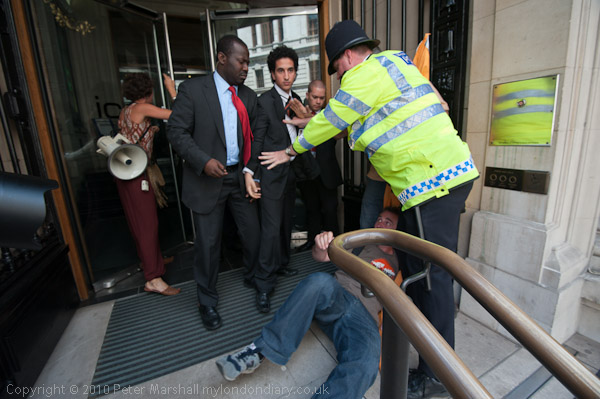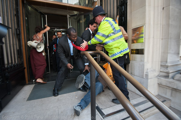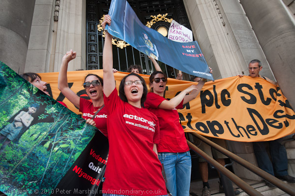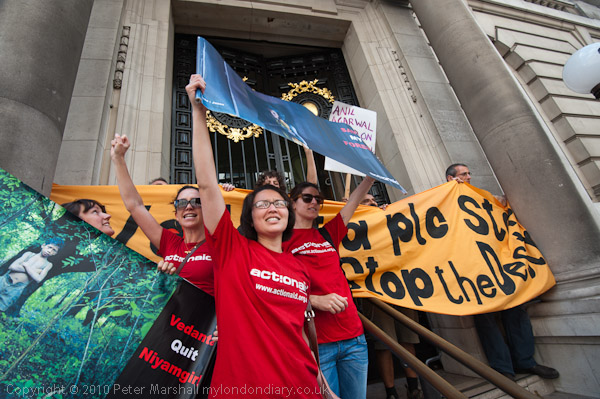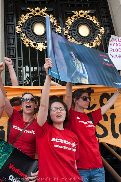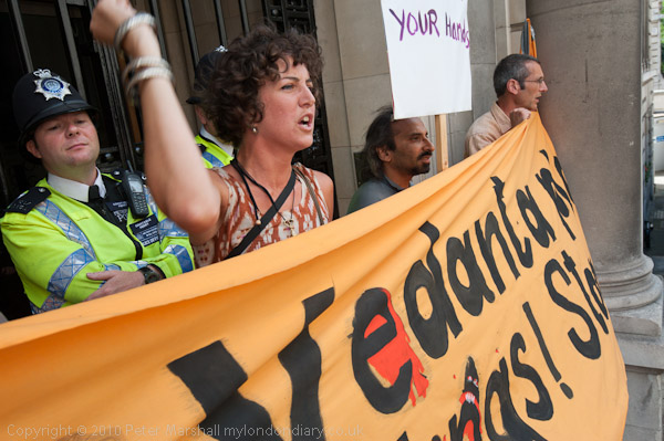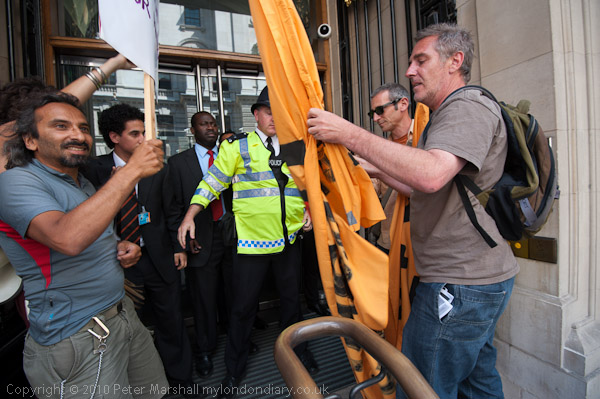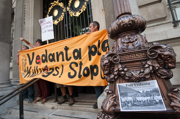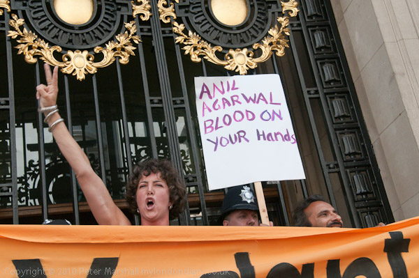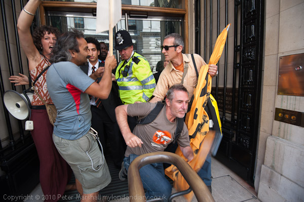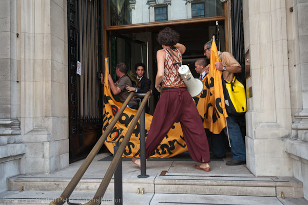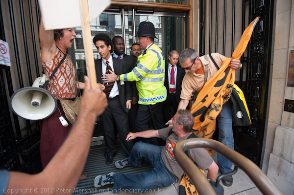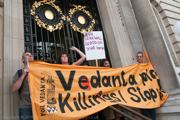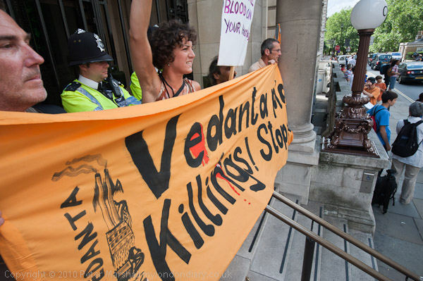 'Foil Vedanta' activists try to rush the doorway and are prevented by security
