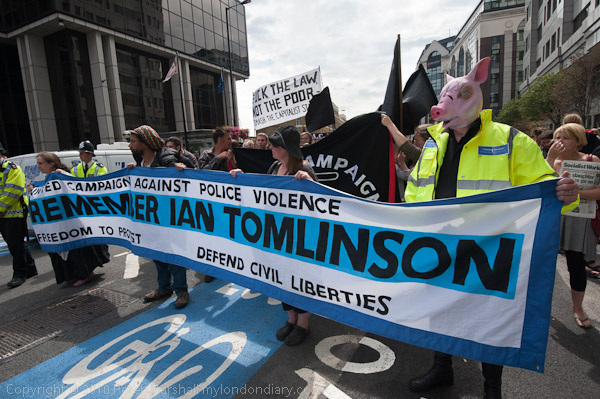 The protesters march into the city to pay respects at the place where Tomlinson died