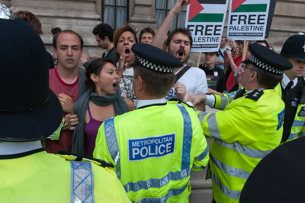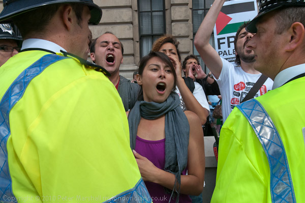 A police officer holds back one of the protesters, but there was no real attempt to break through the police line