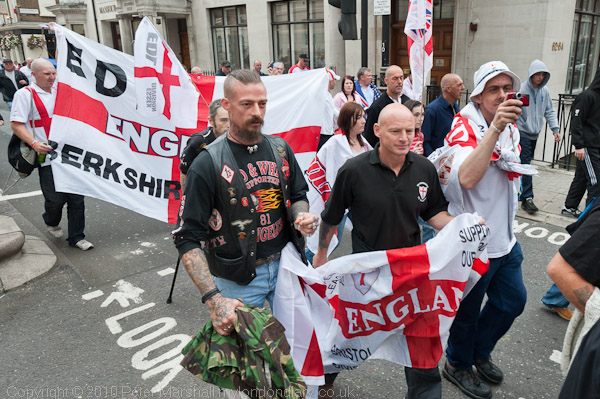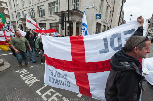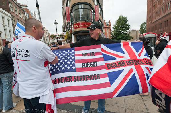 Another EDL flag combining the US Flag and the Union Jack, with the message 'Never Forget & Never Surrender'