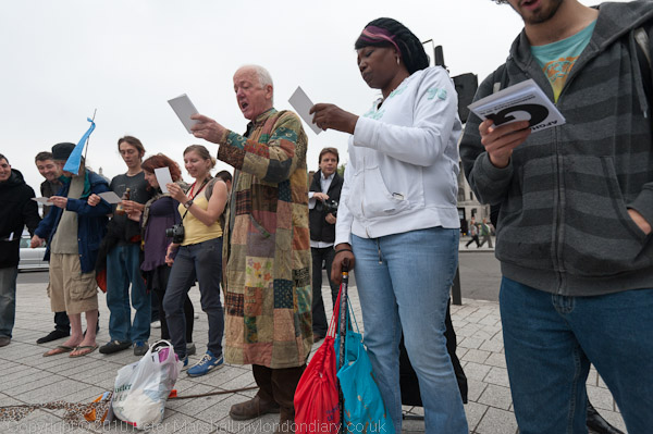 ![]() A circle forms to sing the campaign's adopted anthem, 'World Turned Upside Down' ![]() a Leon Rosselson song popularised by Billy Bragg about the Diggers who occupied St George's Hill in ![]() Weybdrige to till the land, and were brutally evicted by thugs paid by the landlords ![]() ![]() ![]() |