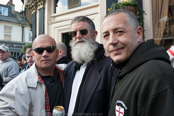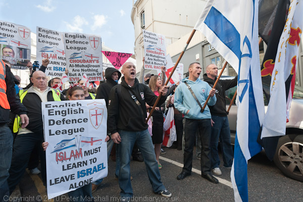 Rabbi Nachum Shifren talks with EDL members outside the pub in Gloucester Rd