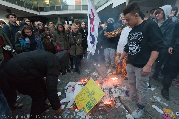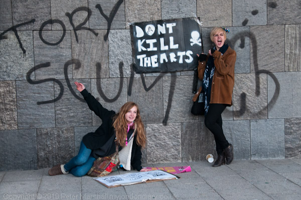 Graffiti on the wall, 'Tory Scum' and two students pose in front of the poster 'Don't Kill the Arts.