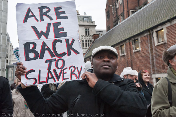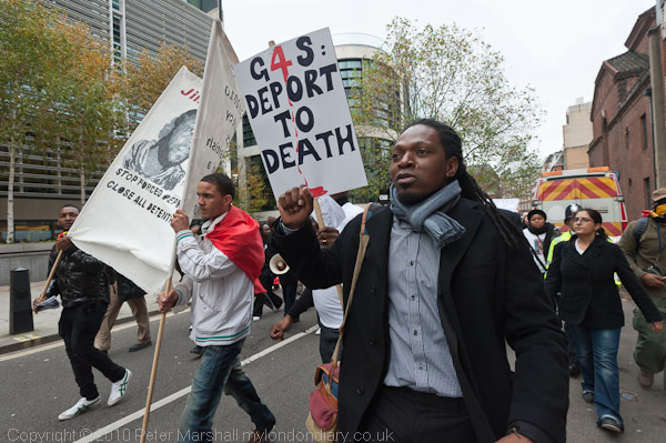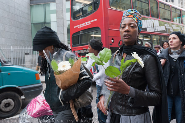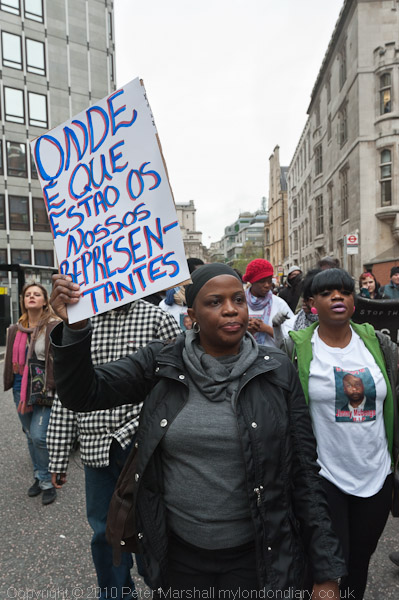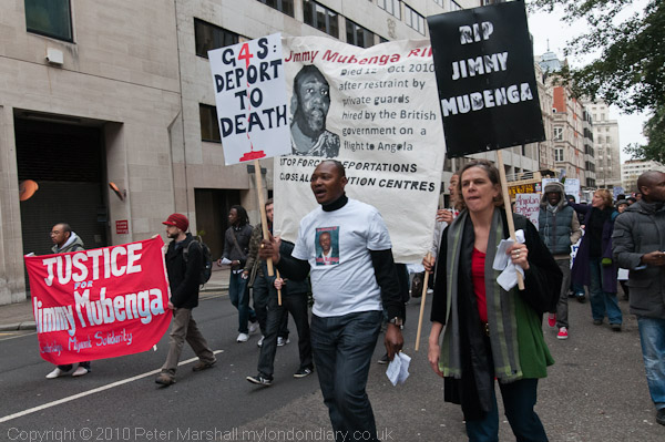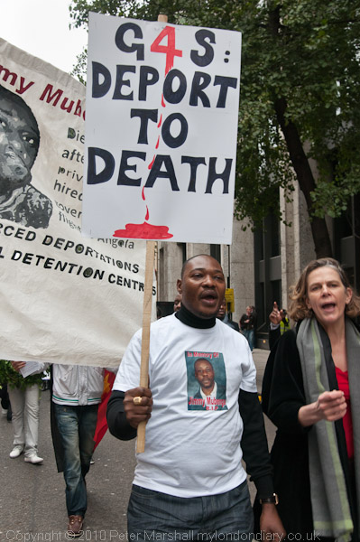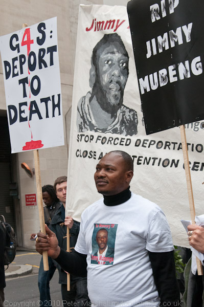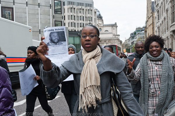 A woman holds up a flyer about Jimmy Mubenga, killed exactly a month ago on a plane at Heathrow