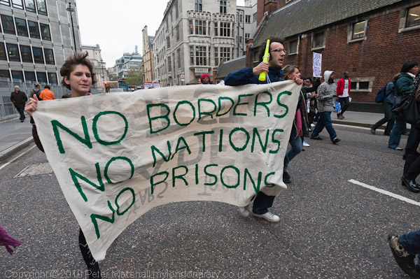 A man from London Catholic Workers with a placard 'Security Comes from Peace and Justice NOT G4S'