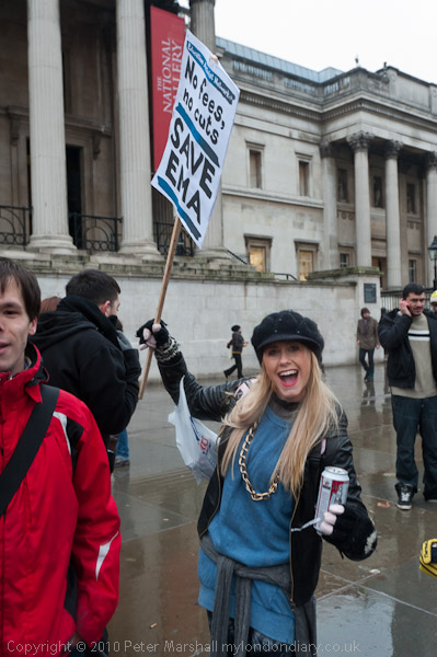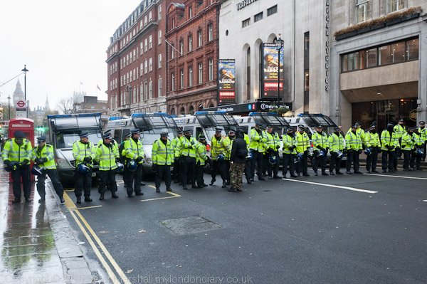 Back at Trafalgar Square, there is a good line of police across Whitehall, but people are walking through unchallenged
