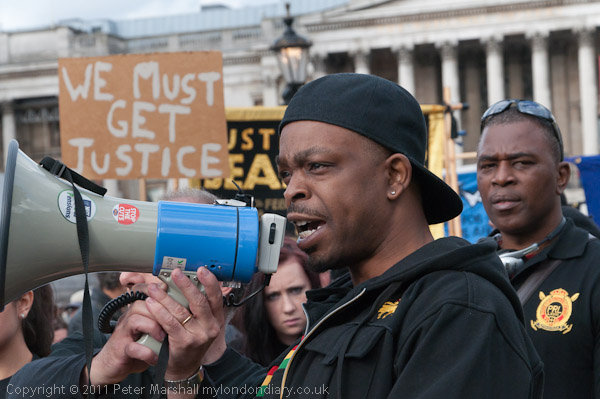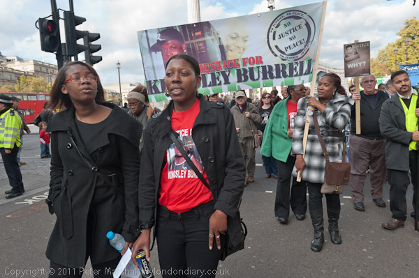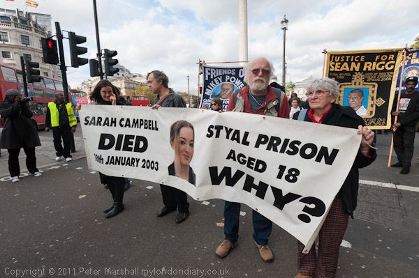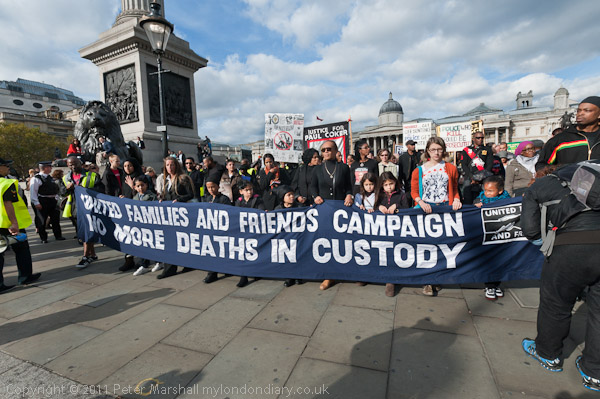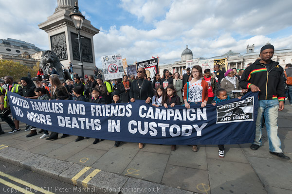 The march with its banner 'No More Deaths in Custody' leaves from Trafalgar Square, walking at a funeral pace