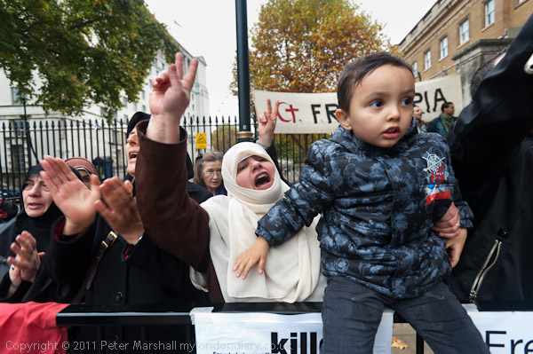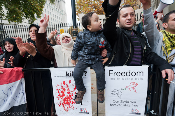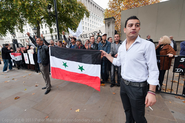 Syrians hold their flag and a 'Free Syria' banner in a protest opposite Downing St