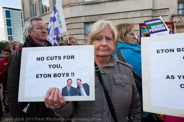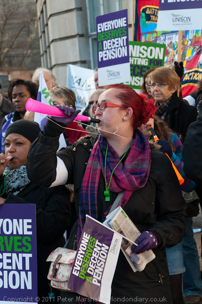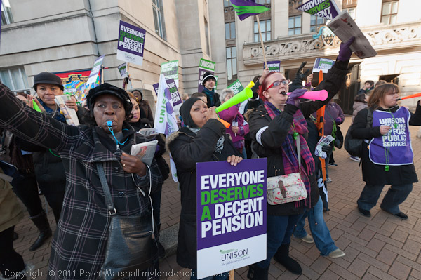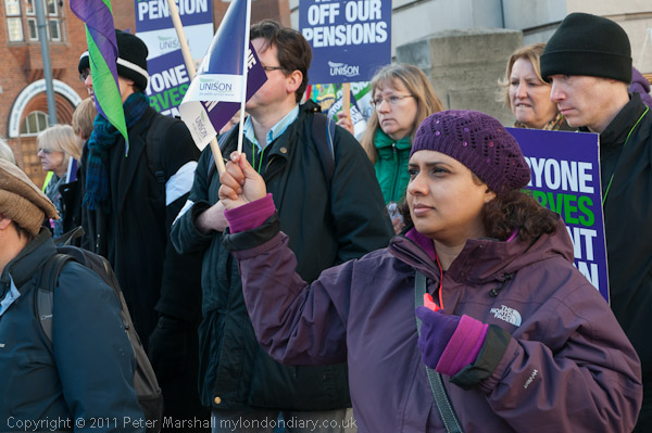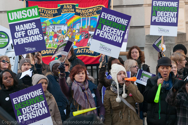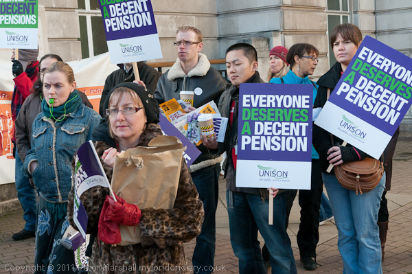 Unison placards say 'Everyone Deserves a Decent Pension' and some pensioners were also present