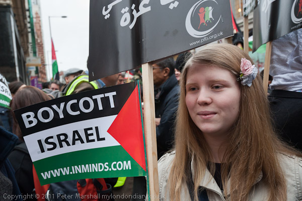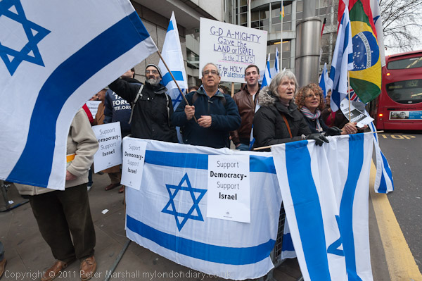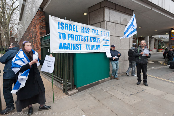 A large banner on the other side of the road read 'Israel has the right to protect itself agains terror'