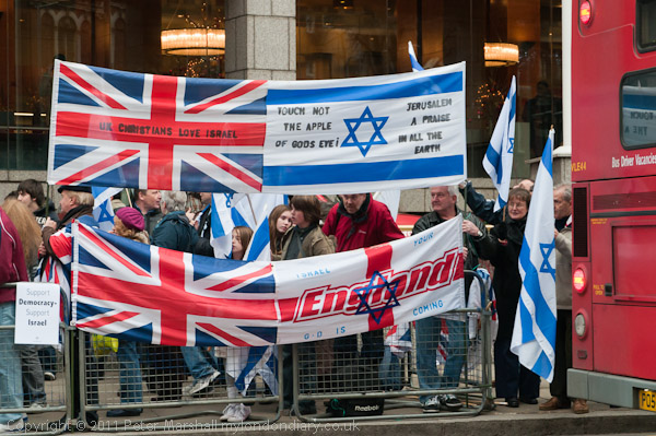 'UK Christians Love Israel' as well as a St George's flag with the Star of David and an Israel flag a message on it.