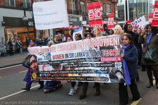Tamil women carried a banner about the terrible war crimes in Sri Lanka