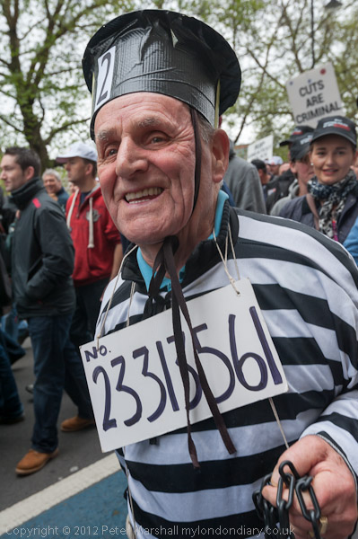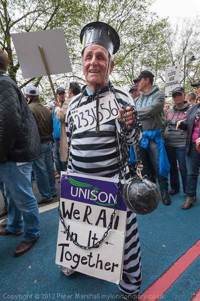 A well known pensioner and protester came to join the march as a protester with ball & chain and a Unison poster 'We R All In It Together'