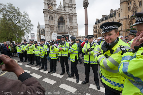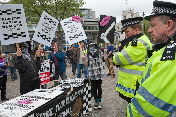 A police line in front of the 'Defend the Right To Protest' banner - another piece of intimidation